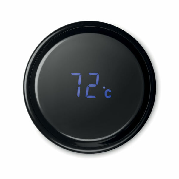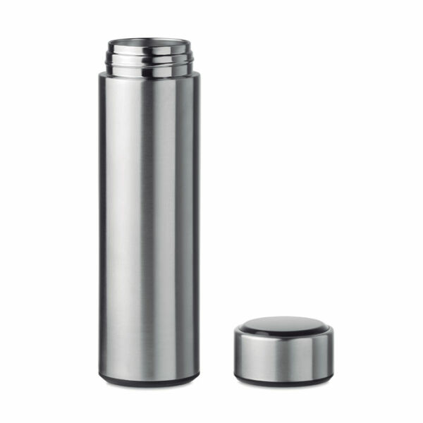 Dubbelwandige RVS fles met vacuüm isolatie en uitneembare theezeef. In de dop zit een geïntegreerde touch LED thermometer. Zo zie je met één aanraking hoe warm je drankje nog is. Inhoud 450 ml. Met 1 vervangbare CR2032 batterij. Lekvrij.